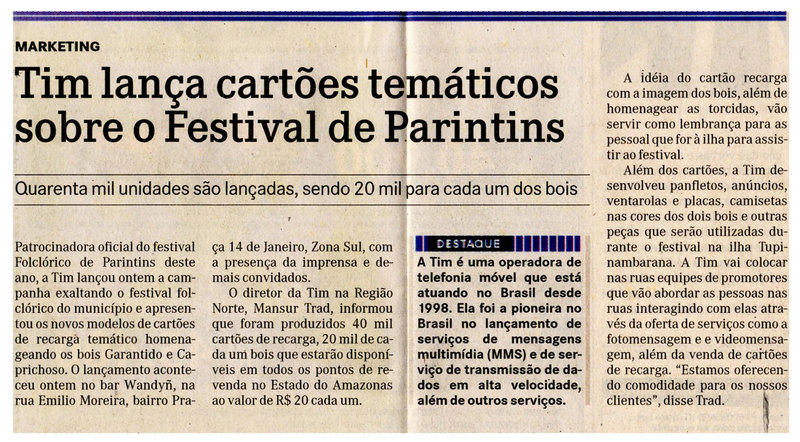 Tim, Cartão Telefônico, Festival de Parintins, Lançamento
