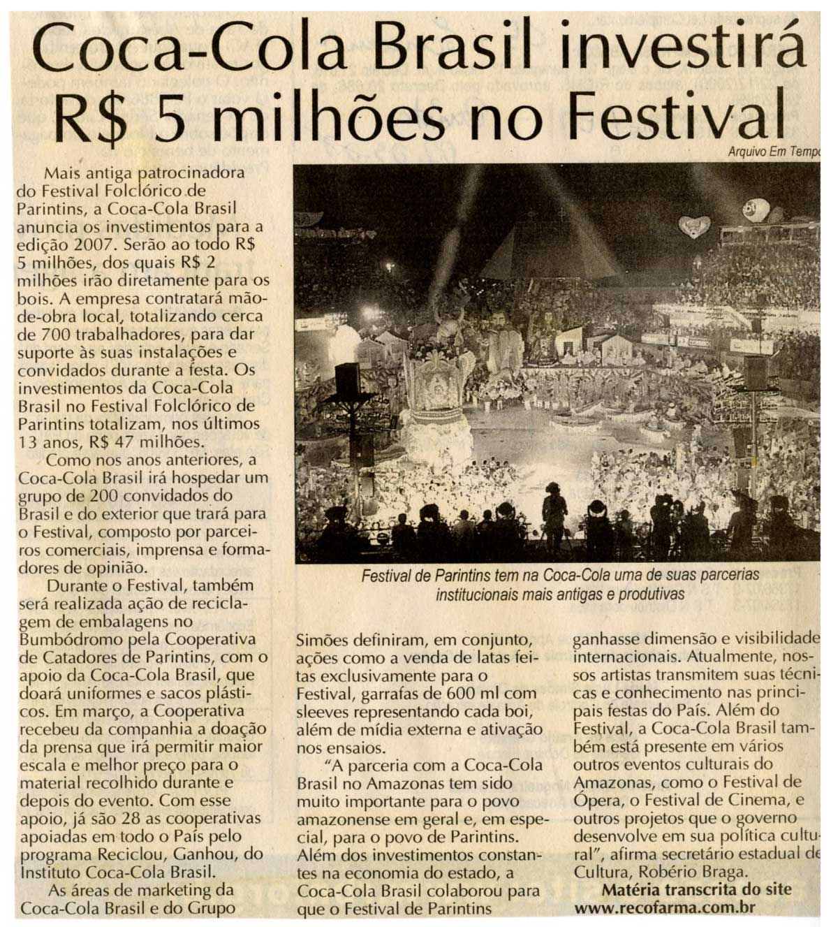 Festival de Parintins, Coca Cola, Patrocinadora, Investimentos, Boi Bumbás, Eventos Culturais, Festival de Ópera, Cinema, Projetos, Robério Braga