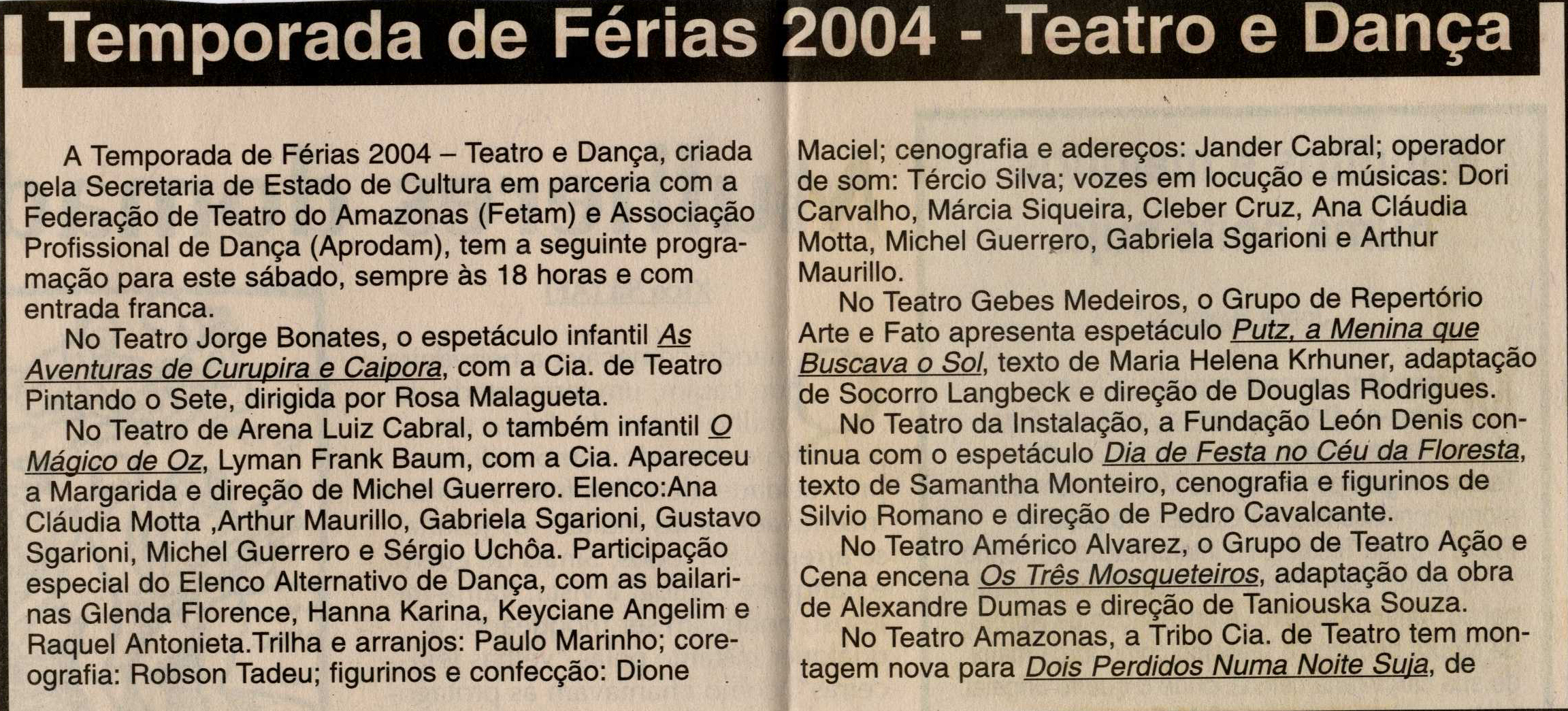 Férias, Sec, Programação, Sábado, Espetáculo Infantil, Teatro Jorge Bonates, Mágico de Oz, Teatro Gebes Medeiros, Teatro da Instalação