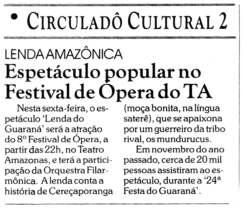 Lenda do Guaraná, Festival de Ópera, Lenda Amazônica, Festa do Guaraná