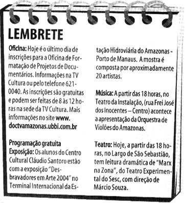 Oficina, Projetos de Documentários, Exposição, Porto de Manaus, Música, Teatro da Instalação, Teatro, Largo São Sebastião