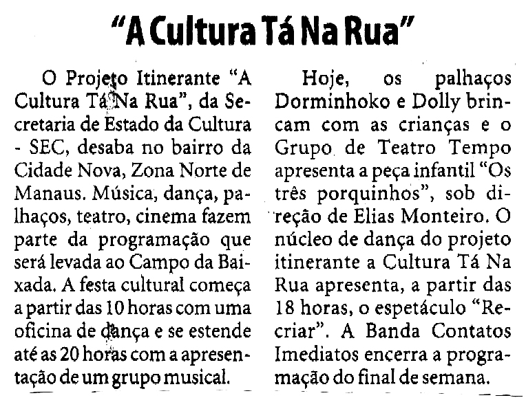 Projeto, A Cultura ta na Rua, Sec, Cidade Nova, Música, Dança, Teatro, Cinema