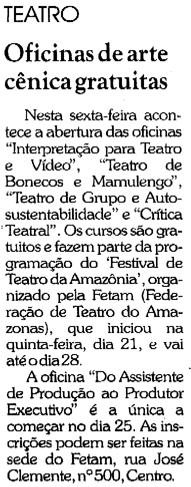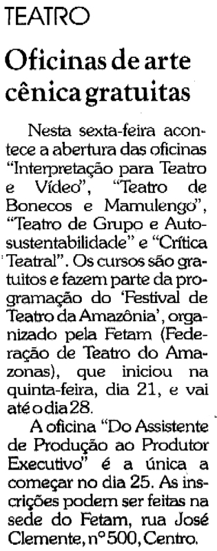 Oficina, Artes cênicas, Interpretação, Teatro, Vídeo, Inscrições, Fetam