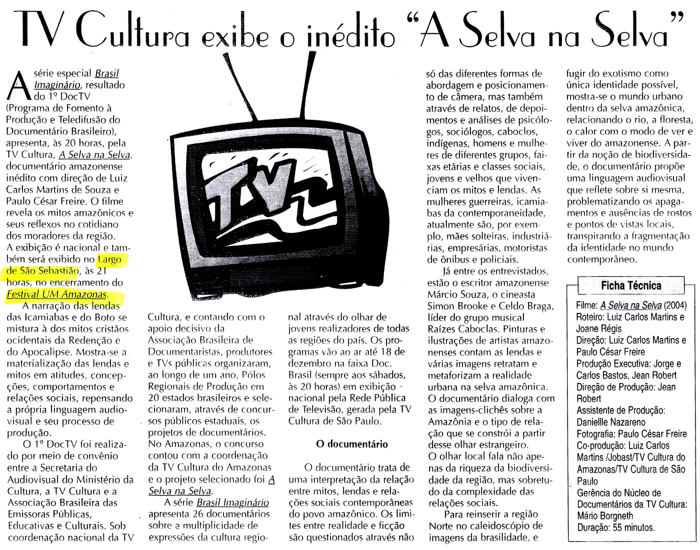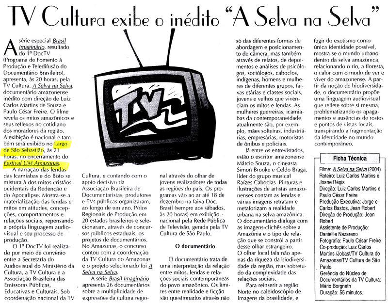 Tv Cultura, Largo São Sebastião, Festival Um Amazonas, Documentário, A selva na selva