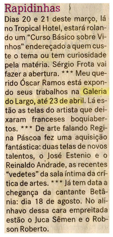 Tropical Hotel, Curso básico sobre vinho, Óscar Ramos, Exposição, Regina Páscoa, Aquisição