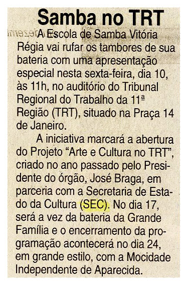Escola de Samba Vitória Régia, TRT, Tribunal Regional do Trabalho, Projeto, Arte e Cultura no TRT, José Braga, Parceria, SEC, Encerramento