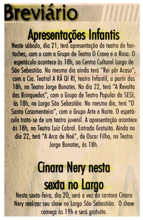 Espetáculo, Largo São Sebastião, Jorge Bonates, Cinara Nery