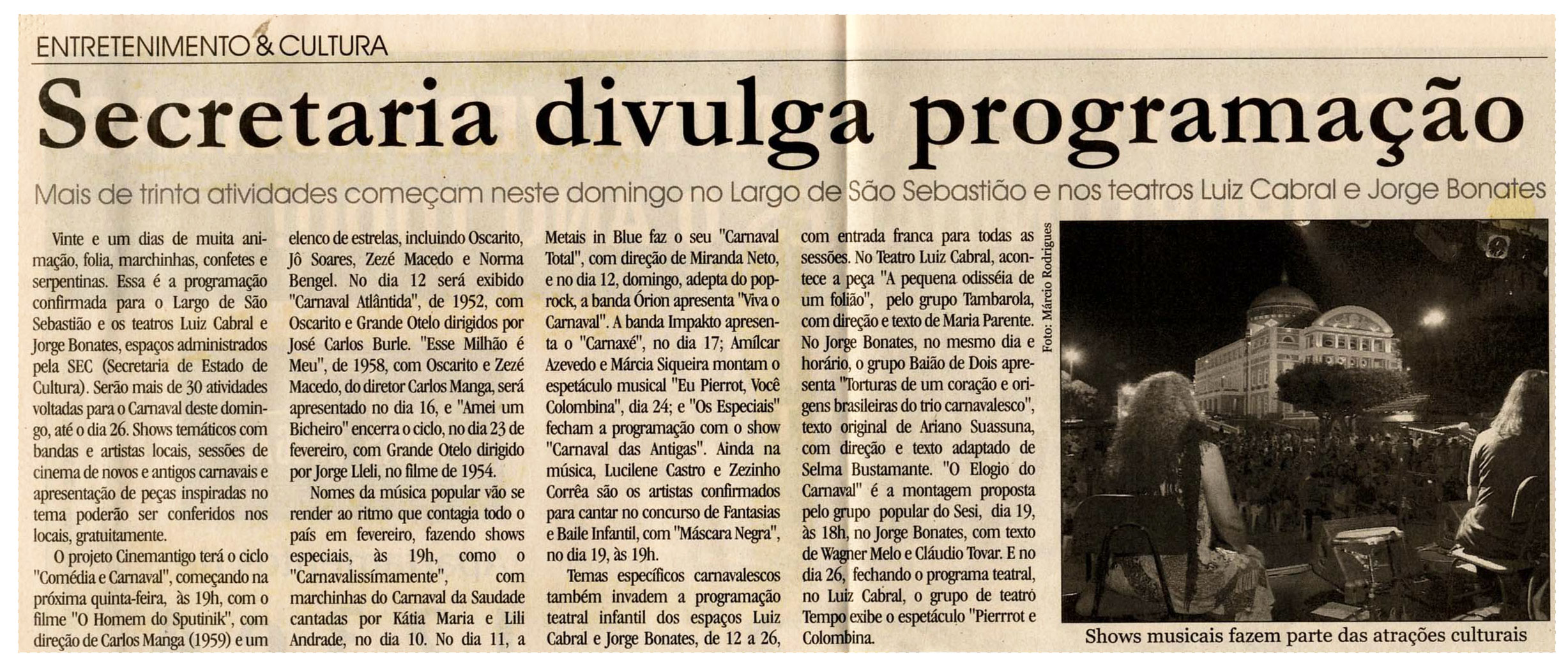 Programação, Sec, Teatros Luiz Cabral e Jorge Bonates, Projeto Cinemantigo, Shows, Carnaval, Concurso de Fantasia, Baile Infantil