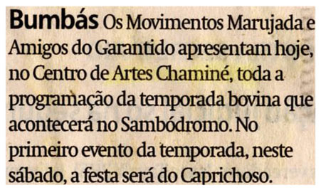 Movimento Marujada, Centro de Artes Chaminé, Programação, Sambódromo, Caprichoso
