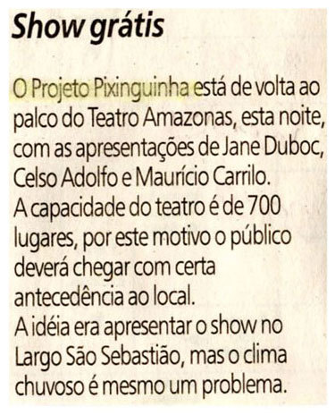 Show, Projeto Pixingunha, Teatro Amazonas, Jane Duboc, Celso Adolfo, Maurício Carrilo