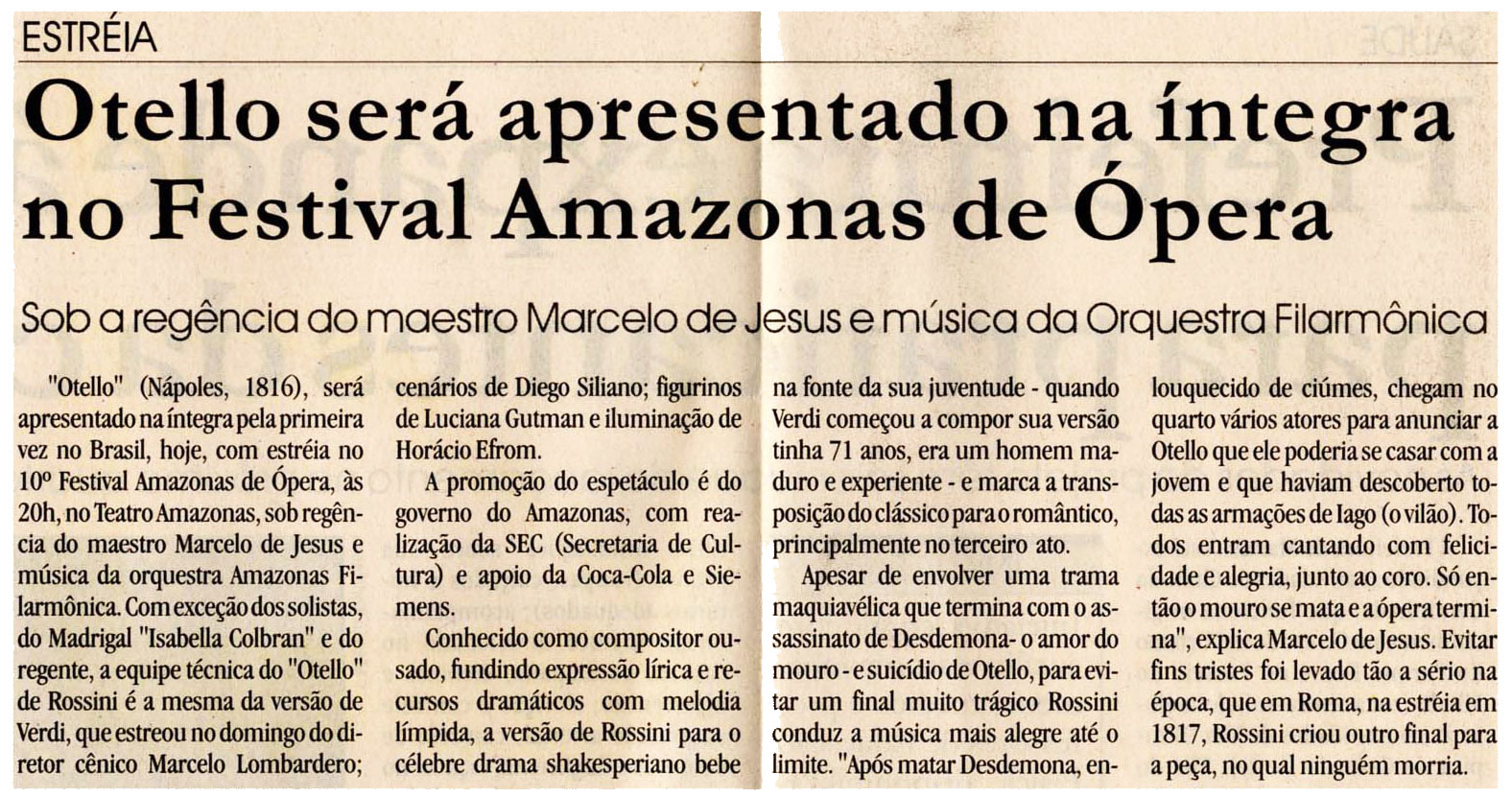 Otello será apresentado na íntegra no Festival Amazonas de Ópera