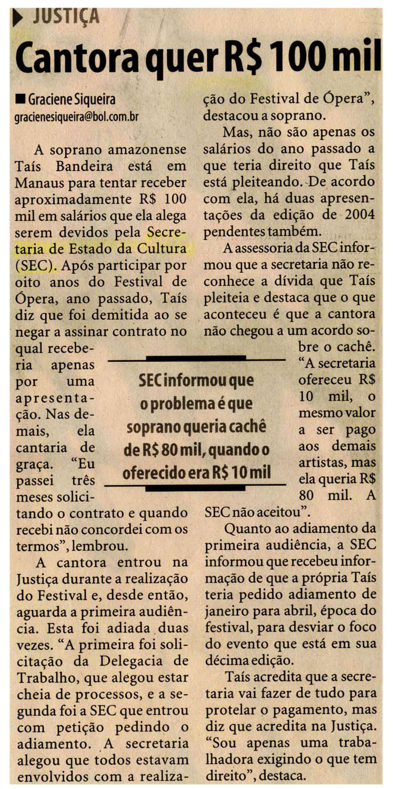 Soprano, Taís Bandeira, Sec, Cachê, Festival de Ópera