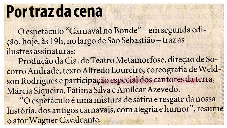 Espetáculo, Carnaval, Largo São Sebastião, Cia Teatro Metamorfose, Márcia Siqueira, Wagner Cavalcante