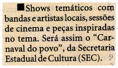 Shows, Bandas, Cinema, Peça, Carnaval, Secretaria de Cultura