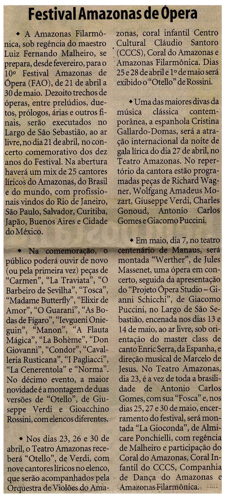 Festival de Ópera, Luiz Fernanado Malheiro, Teatro Amazonas, Largo São Sebastião