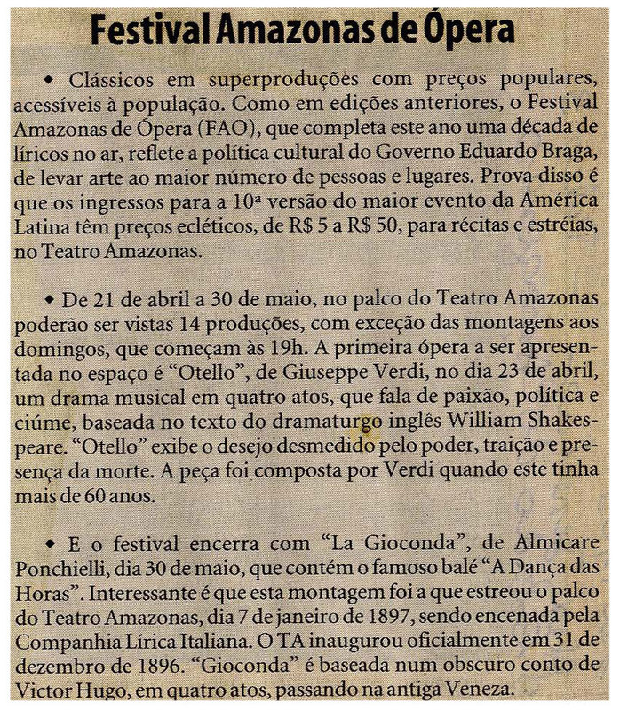 Clássicos, Festival, Ópera, Eduardo Braga, Teatro Amazonas