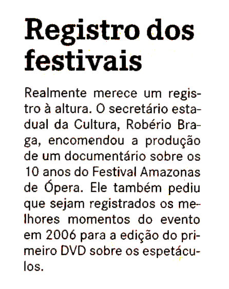 Robério Braga, Documentário, Festival Amazonas de Ópera, Espetáculos