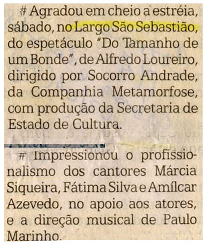 Espetáculo, Largo São Sebastião, Cia Metamorfose, Alfredo Loureiro, Sec, Márcia Siqueira, Fátima Silva, Amílcar Azevedo