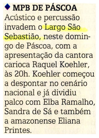 MPB, Acústico, Percussão, Largo São Sebastião, Páscoa, Raquel Koehler