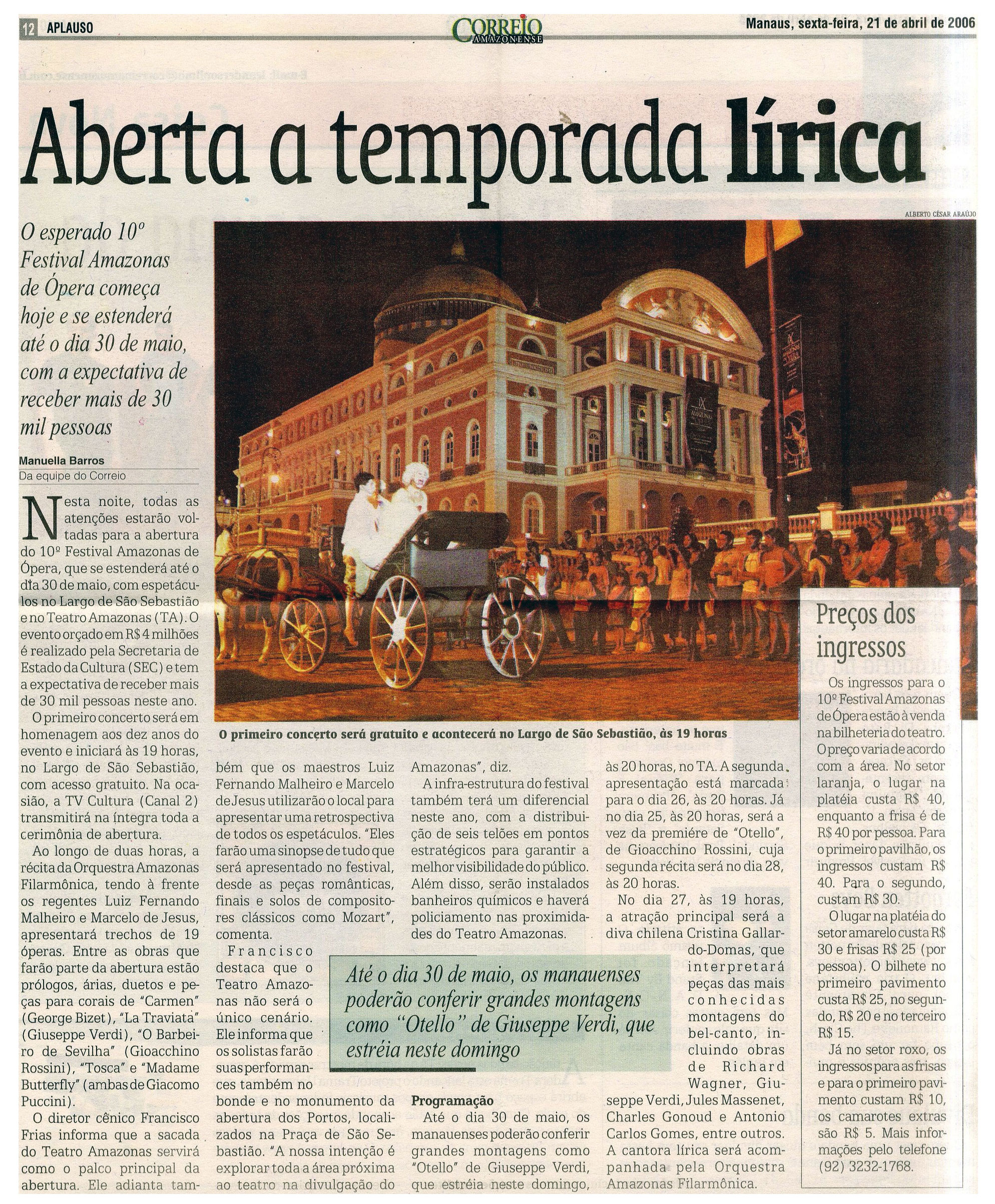 Festival de Ópera, Espetáculos, Largo São Sebastião, Teatro Amazonas, Sec, Orquestra, Luiz Fernando Malheiro, Marcelo de Jesus