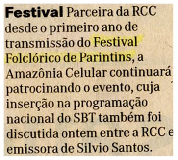 Festival Folclórico de Parintins, RCC, Amazônia Celular, Programação, SBT, Emissora
