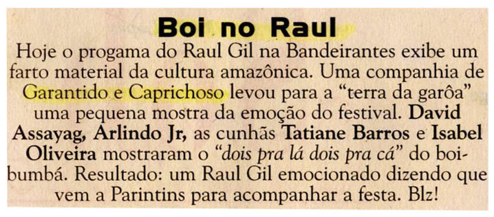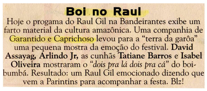 Boi, Programa, Raul Gil, Banderantes, Garantido, Caprichoso, David Assayag, Arlindo Júnior, Tatiane Barros, Isabel Oliveira, Parintins