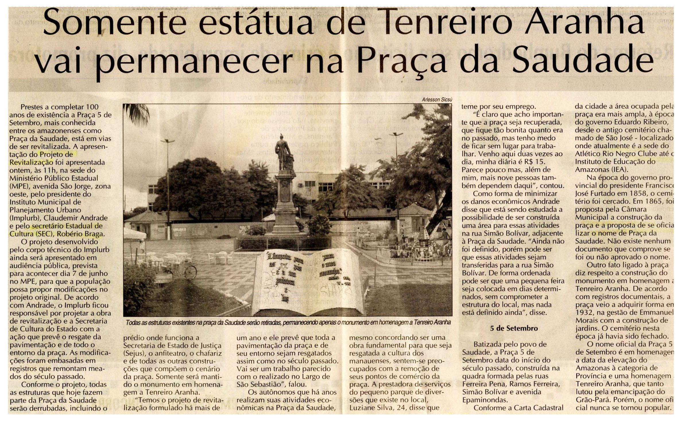 Tenreiro Aranha, Estátua, Praça da Saudade, Projeto de Revitalização, Sec, Robério Braga