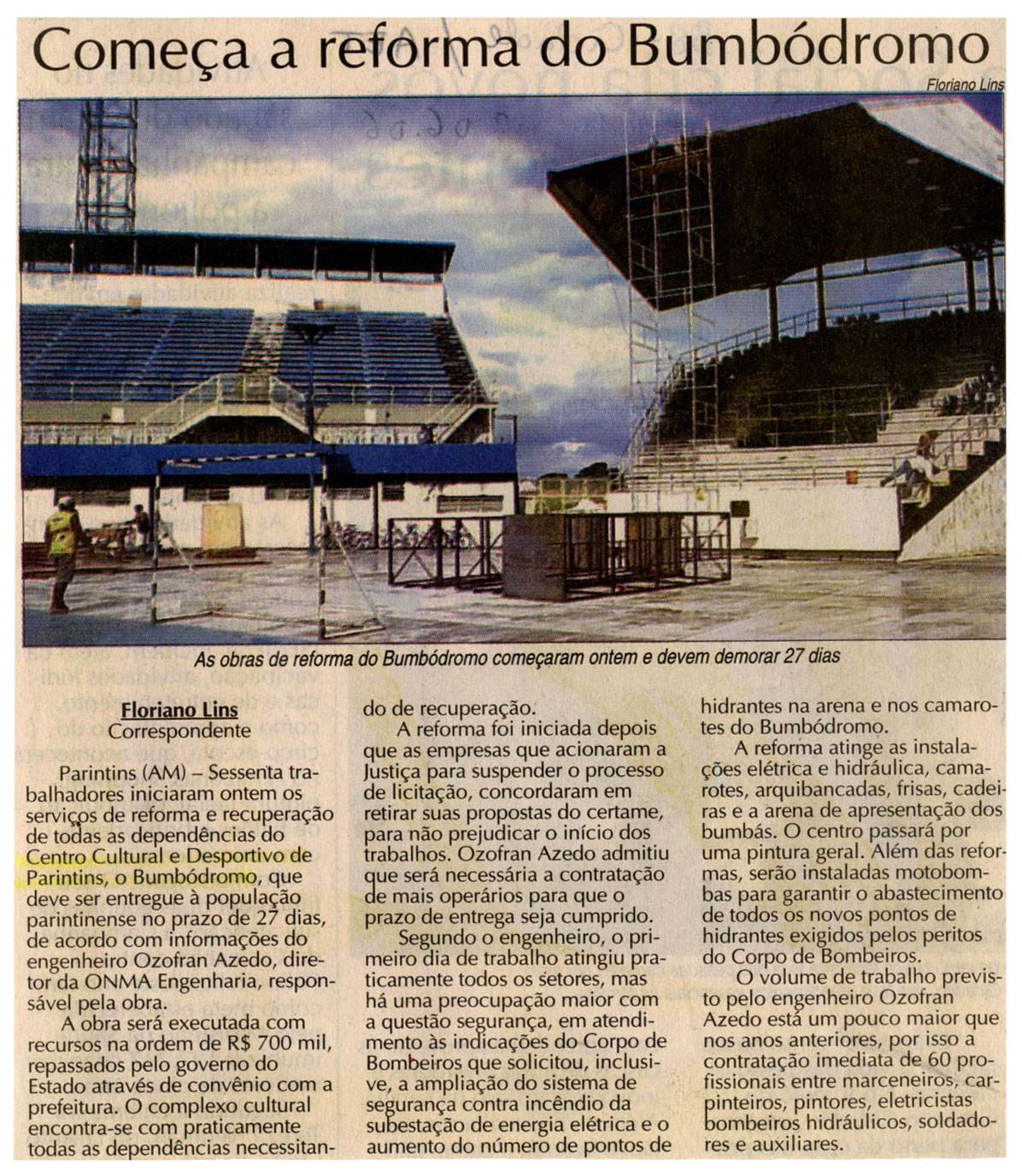Obras, Reforma, Bumbódromo, Parintins, Corpo de Bombeiros, Ozofran Azedo, ONMA, Construtora