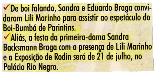 Sandra Braga, Eduardo Braga, Lili Marinho, Convite, Parintins, Exposição Rodin, Palácio Rio Negro