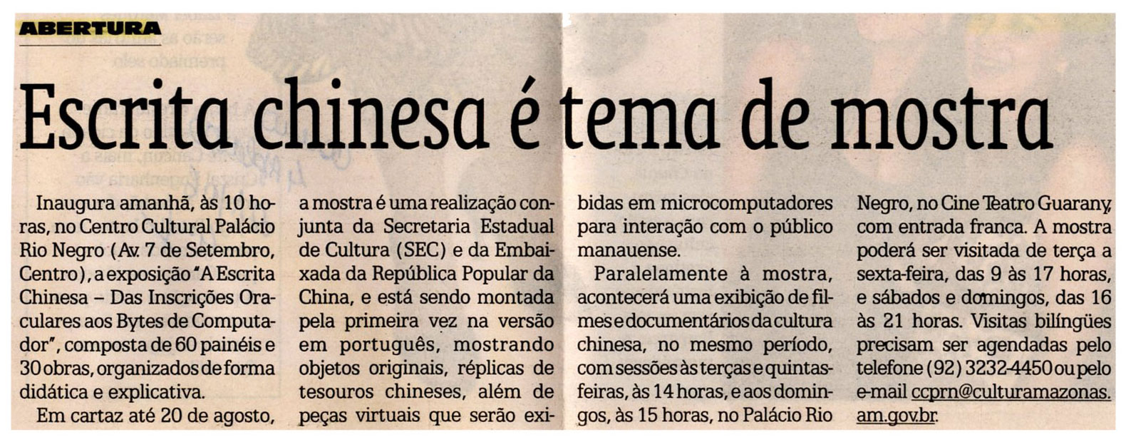 Abertura, Exposição, Escrita Chinesa, SEC, Palácio Rio Negro