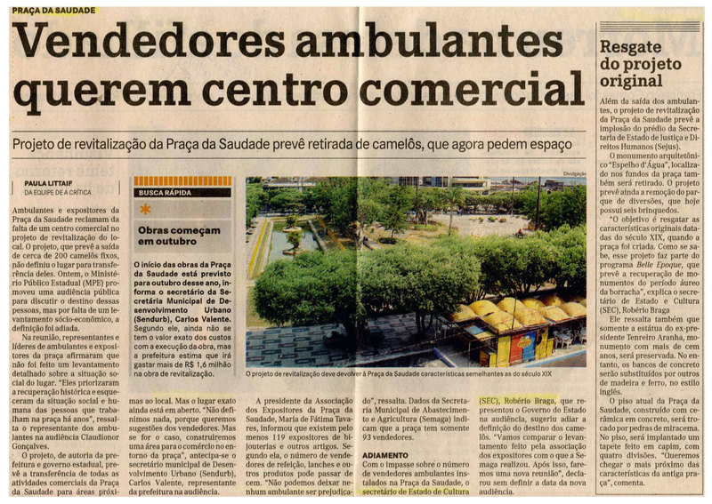 Vendedores Ambulantes, Praça da Saudade, Projeto de Revitalização, Ministério Público, Sendurb, Robério Braga, Governo do estado
