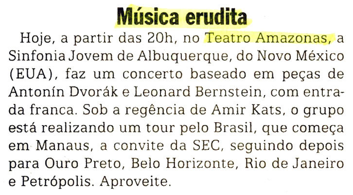 Teatro Amazonas, Sinfonia Jovem de Albuquerque, EUA, Concerto, Antonin Dvorák, Leonard Benstein, Amir Kats, Tour, Brasil, Sec, Manaus, Música Erudita