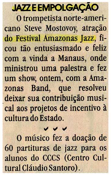 Jazz, Trompetista, Steve Mostovoy, FAJ, Palestra, Amazonas Band, Doação, Partituras, CCCS