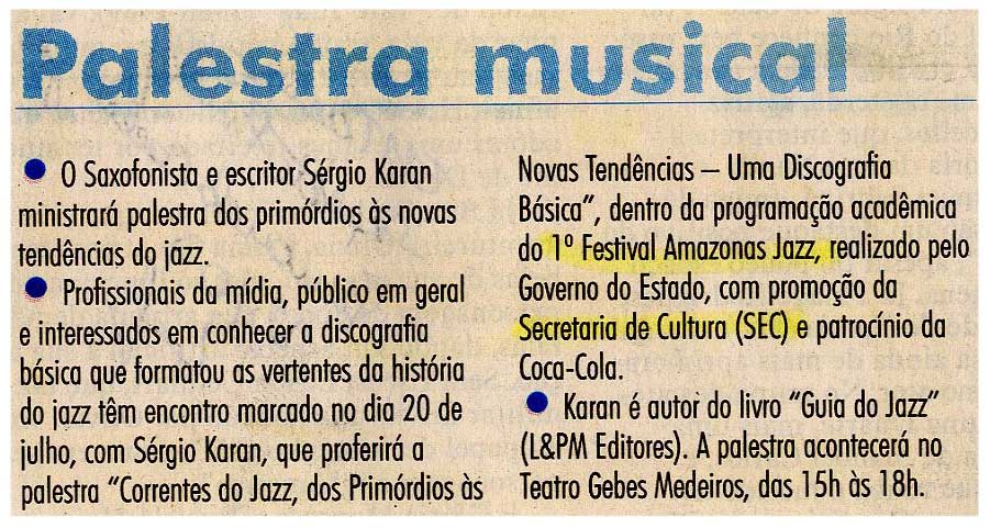 Palestra, Sérgio Karan, Festival de Jazz, Governo do Estado, Sec, Teatro Gebes Medeiros