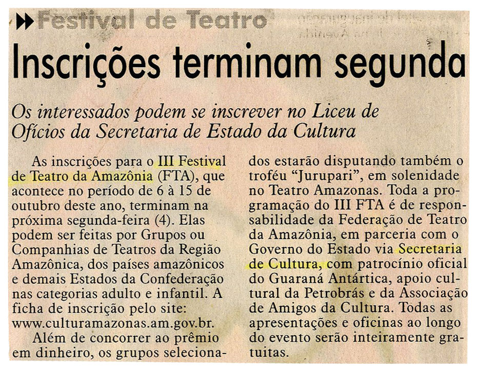 Festival de Teatro, Liceu de Ofícios, Sec, Inscrição, Governo do Estado