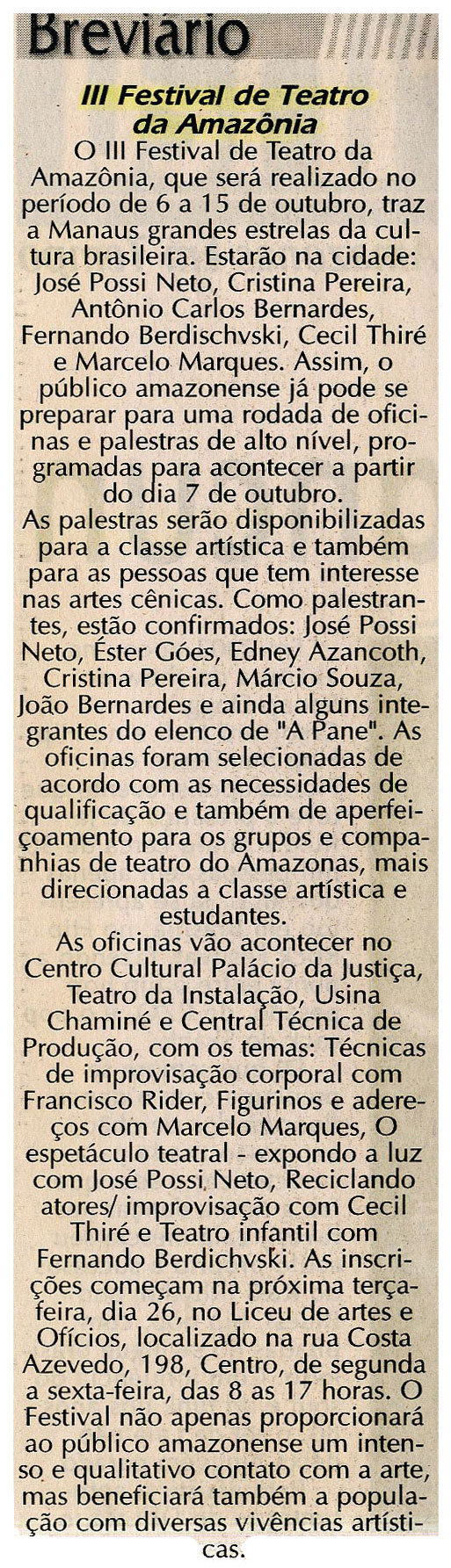 Festival de Teatro, Palestra, Oficinas, Palácio da Justiça, Teatro da Instalação, Usina Chaminé