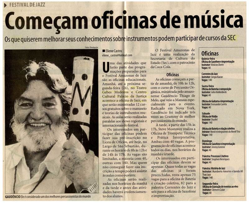 Festival de Jazz, Oficinas, Teatro Gebes Medeiros, Palácio da Justiça, Cursos, Inscrição, Sec