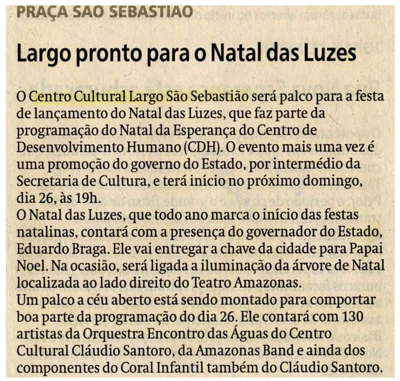 Largo São Sebastião, Natal das Luzes, CDH, Governo do Estado, Sec, Eduardo Braga, Teatro Amazonas, Orquestra, Coral, Cláudio Santoro