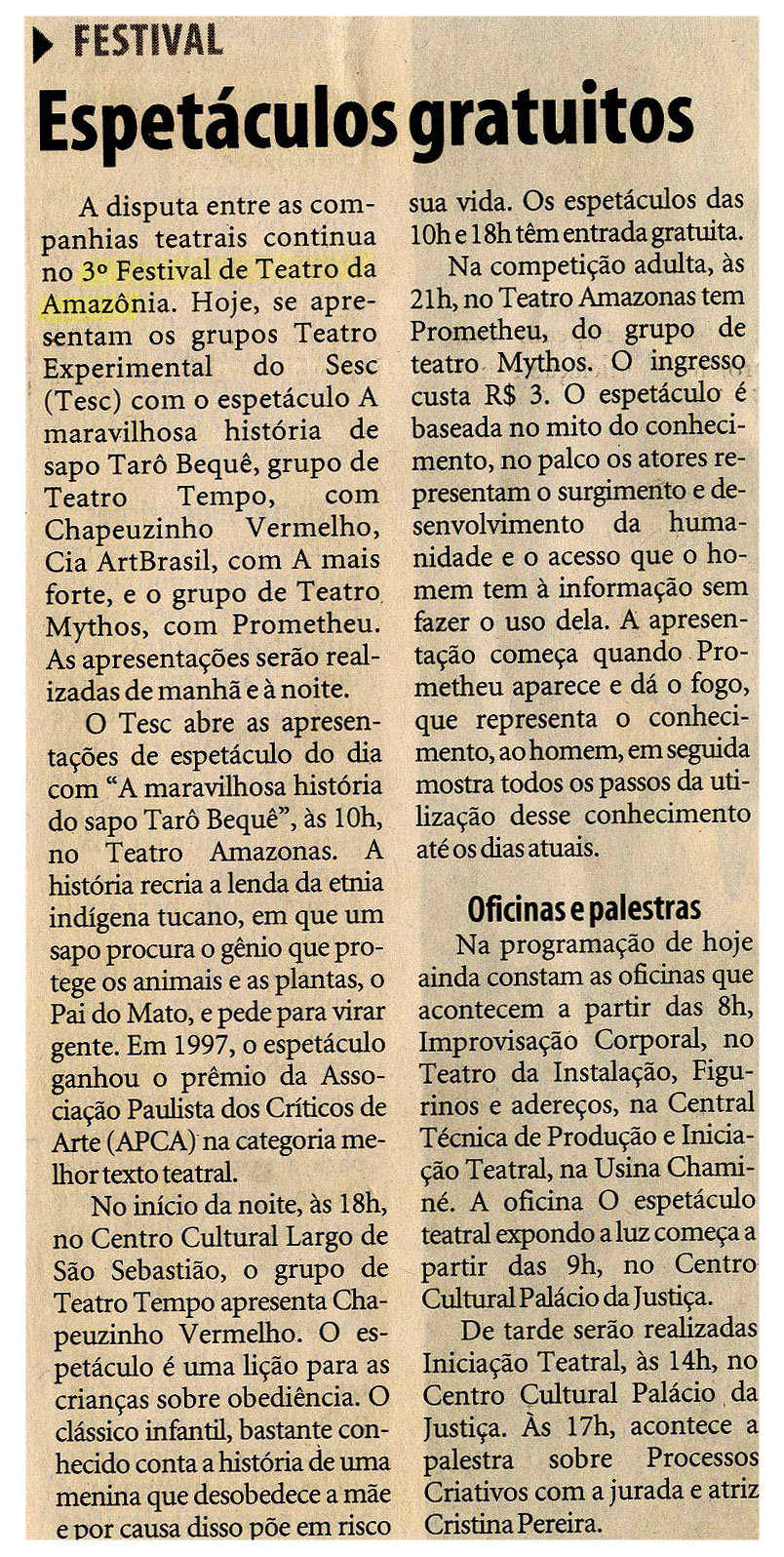 Espetáculos, 3º Festival de Teatro do Amazonas, Teatro Experimental do Sesc, Ofinas, Palestras, Largo, Teatro Amazonas, Teatro da Instalação