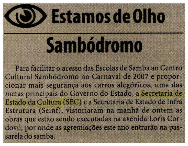 Escolas de Samba, Acesso, Sambódromo, Sec, Seinf, Governo do Estado, Loris Cordovil, Obras, Vistoria