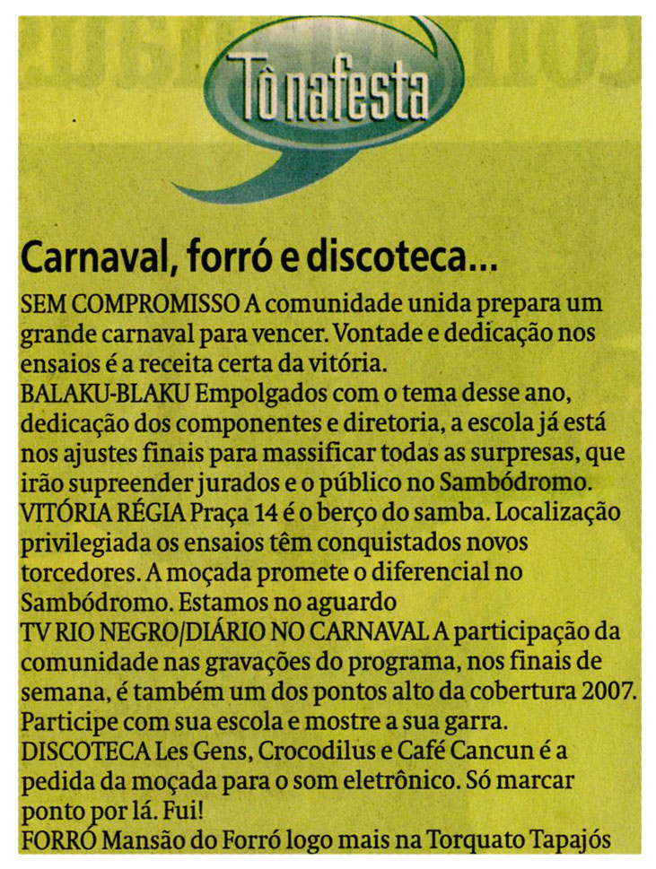 Carnaval, Sem Compromisso, Balaku-Blaku, Vitória-Régia, TV Rio Negro, Diário no Carnaval, Discoteca, Forró