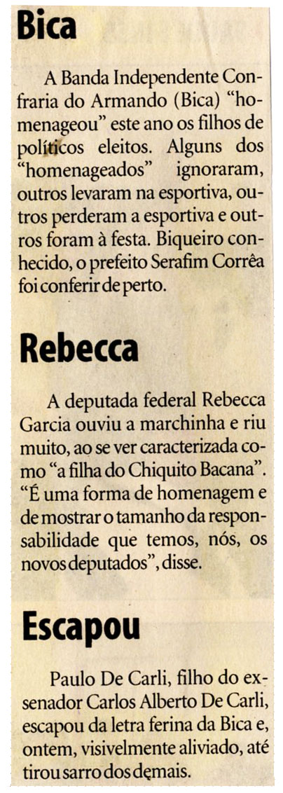 Carnaval, Banda da Bica, Confraria do Armando, Homenagem, Políticos, Rebeca Garcia